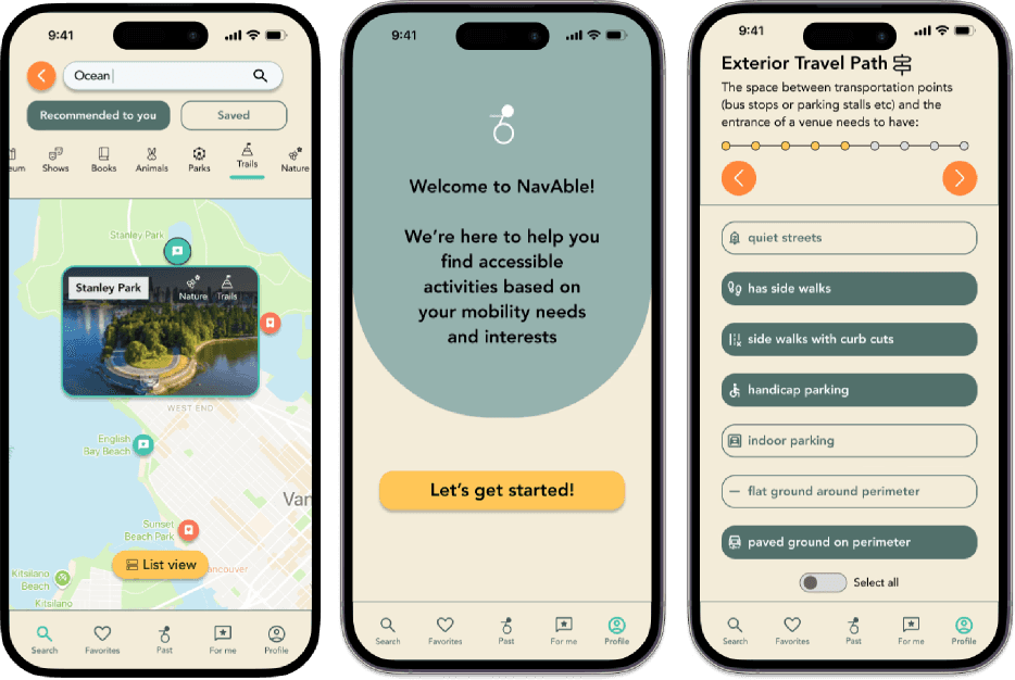 Solo designed iOS app helping people with mobility disabilities discover accessible activities. Conducted user research with 8 participants and created end-to-end flows for location search, accessibility filtering, and community-driven reviews.