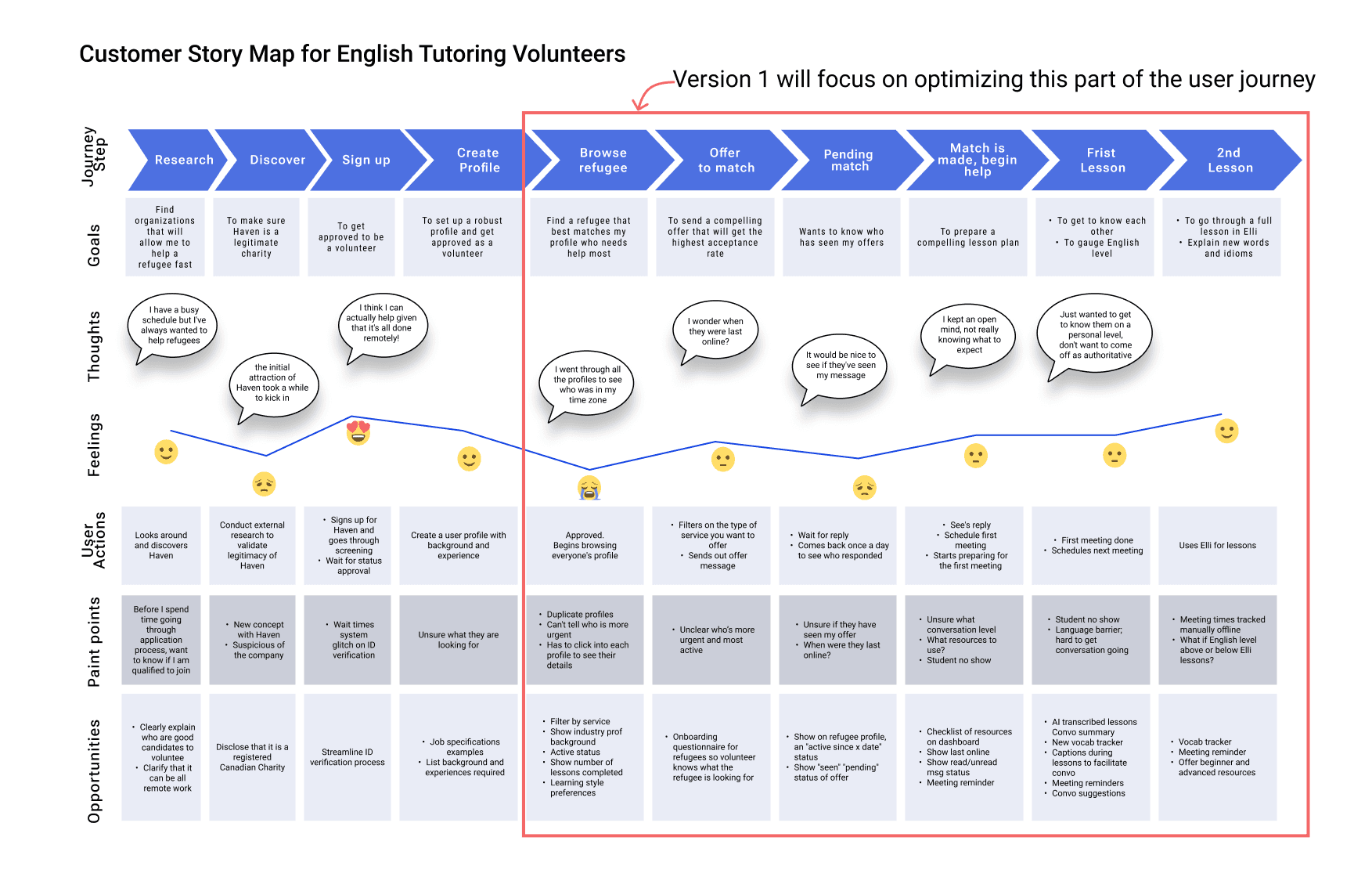 Haven is an online platform connecting Canadians with refugees for personal support across multiple services including English tutoring, career coaching, hosting, and free items. Given Haven's two primary user groups (volunteers and refugees) and diverse service offerings, our team prioritized improving the volunteer experience within English tutoring.